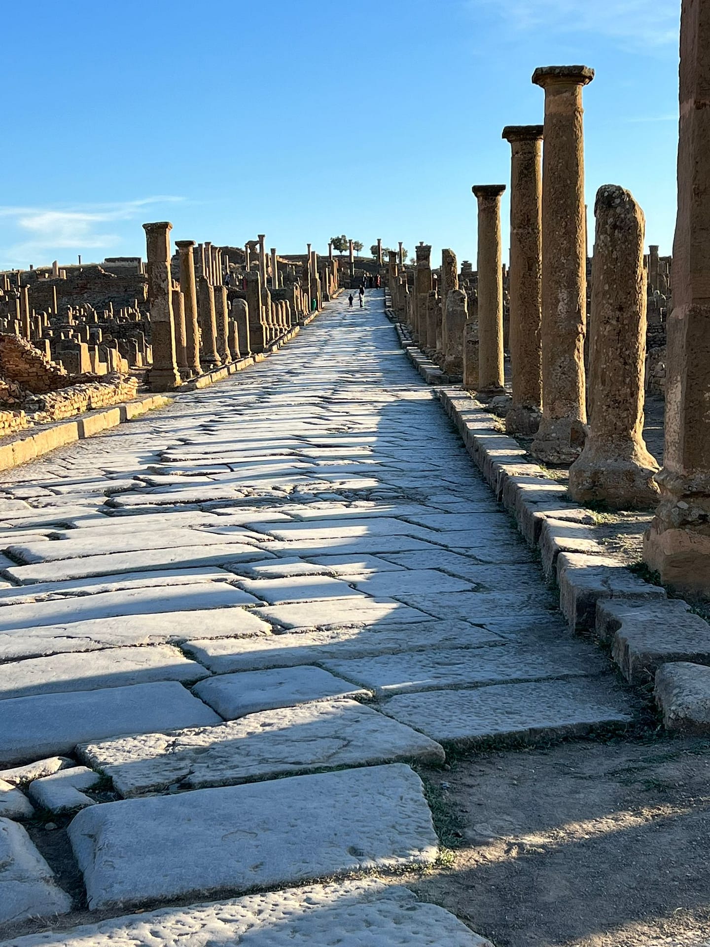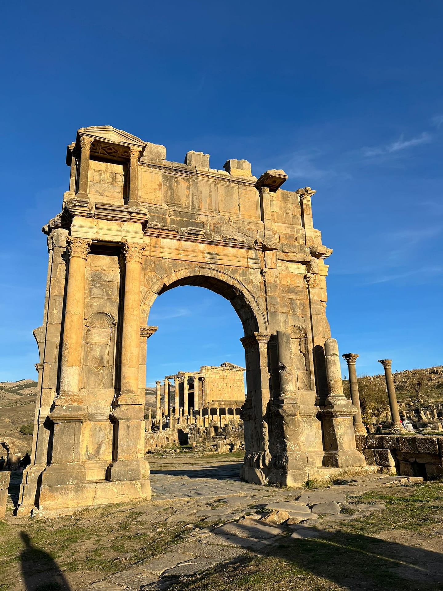 Timgad fut fondée par Trajan pour abriter une colonie de vétérans, et construite par les légionnaires au pied des Aurès, l’antique Thamugadi obéit aux règles les plus strictes observées pour la construction d’un camp. Inscrit dans un carré de 365 m de côté, et totalement préservé, ce quadrillage urbain d’inspiration militaire laisse admirer de larges avenues ornées d’arcs monumentaux, un vaste forum en communication avec le théâtre, un rare exemple de bibliothèque publique, plusieurs marchés, nombre d’habitations privées ou les 14 établissements balnéaires qui faisaient l’agrément de la cité. Une forteresse et plusieurs églises, dont le quartier épiscopal donatiste, témoignent du dynamisme de la ville à l’époque byzantine. Extraordinaire.